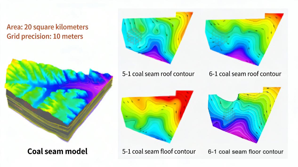 Based on the overall framework, the coal seam model is further refined. The system independently models each coal seam in the mining area and generates top and bottom contour maps for each seam. This step makes seam undulation, thickness variation, and spatial distribution crystal clear, like conducting a high-definition 3D survey of coal seams, supporting the precise design of mining schemes.